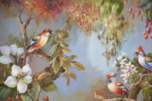 Oil Painting on Canvas, With Antique Gold Ornate Frame, For Memorable Gift, Wild Birds on the Tree, Signed by L Richard, Korean Artist