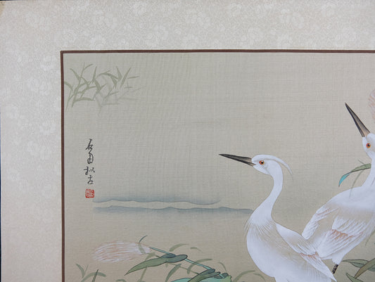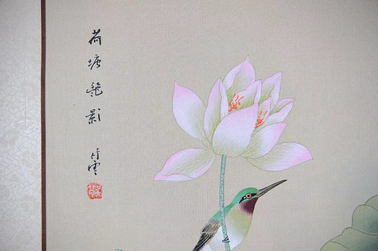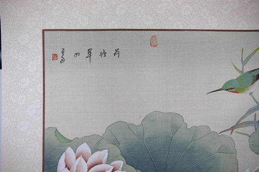 Vintage Asian Watercolor on Silk Paper, Oriental Painting, Lotus and Kingfisher