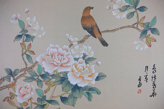 VTG Asian Watercolor on Silk Paper, Vintage Oriental Chinese Painting, Beautiful Bird and Flowers, Stamped and Signed