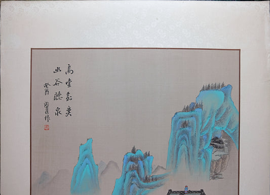 Vintage Oriental Painting, Asian Watercolor on Silk Paper, Vintage Chinese Painting, Blue Mountain Landscape