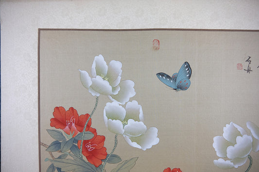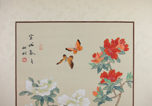 Vintage Oriental Painting, VTG Asian Painting on Silk Paper, Butterfly on Peony