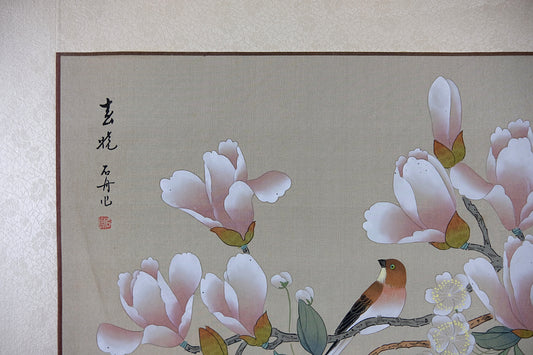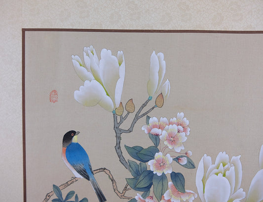 Vintage Chinese Painting on Silk Paper, Oriental Watercolor Painting, Bluebird on a Magnolia Tree, Artist Signed Stamped