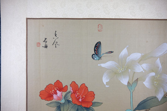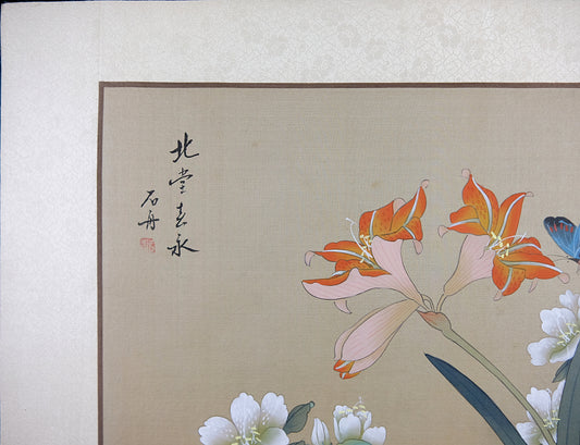 Vintage Asian Art Watercolor, Vintage Oriental Painting on Silk Paper, Blue Butterfly with Wild Lily
