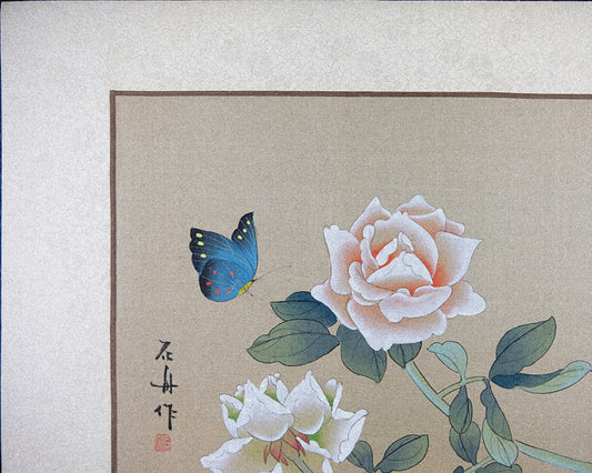 Vintage Asian Art Watercolor, Vintage Oriental Painting on Silk Paper, Blue Butterfly and Rose