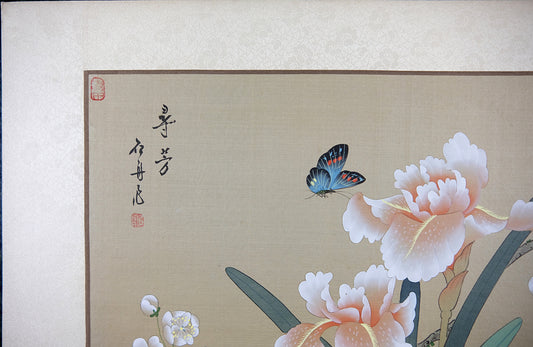 Vintage Oriental Chinese Painting, VTG Asian Art on Silk, Butterfly, Pink Iris