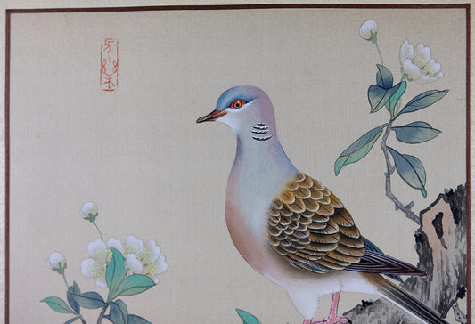 Vintage Asian Painting, Chinese Watercolor on Silk Paper, Wild Pigeon Portrait
