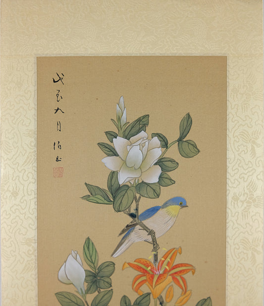 Vintage Asian Watercolor, Blue Bird on the Summer Flower, Oriental Chinese Watercolor Painting on Silk Paper, VTG Asian Wall Art